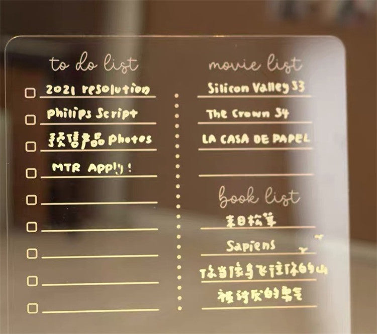 Funciones: Ofrece iluminación LED decorativa, superficie acrílica para escritura, diseño transparente, estética minimalista y capacidad para mostrar notas, dibujos o fotografías.